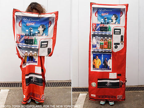Actually, thank the Japanese (natch). That’s right, a visionary Japanese designer has created a skirt that converts into a life-size vending machine that women can hide behind to outwit predators.